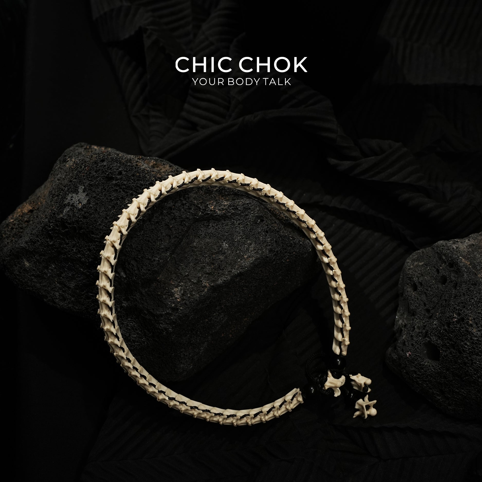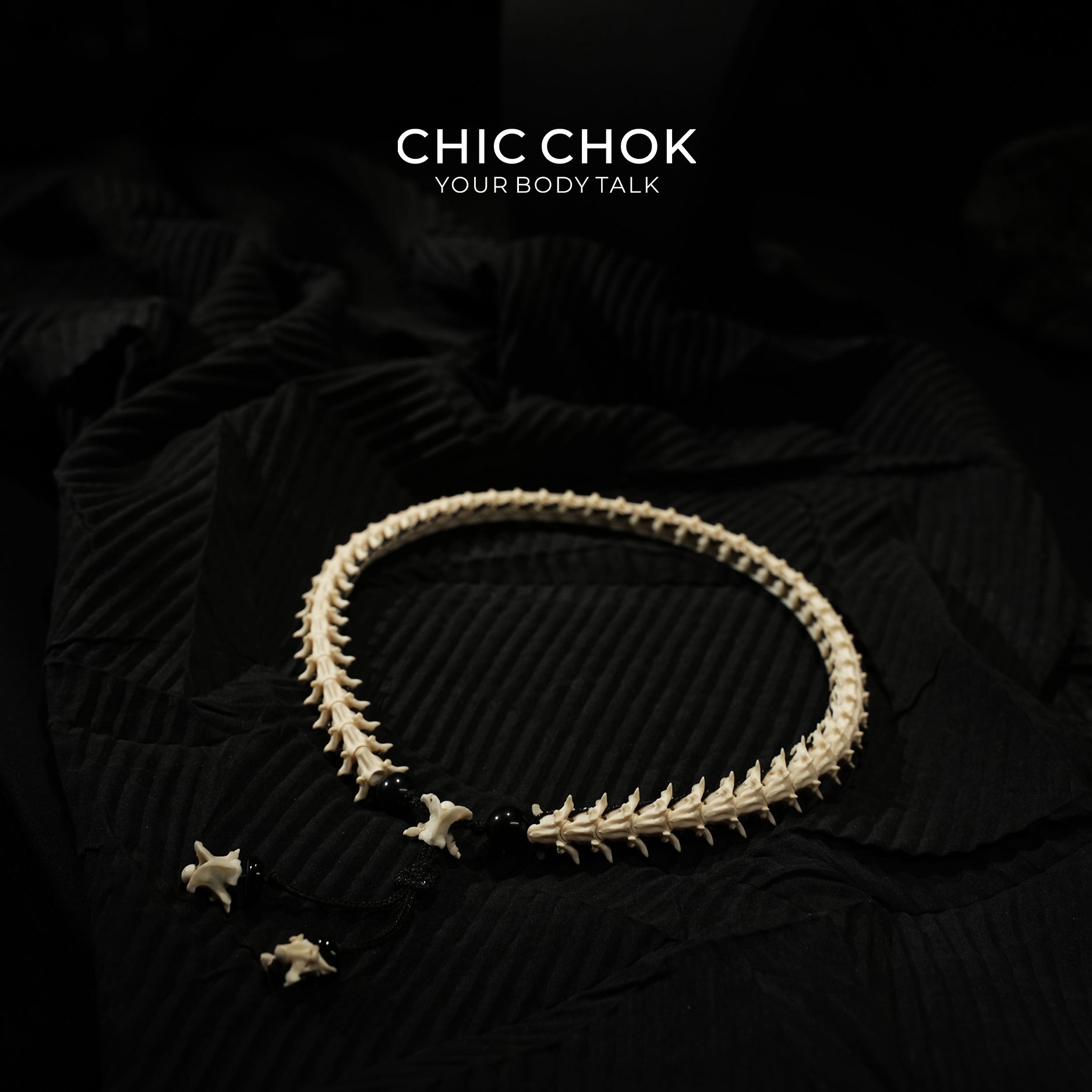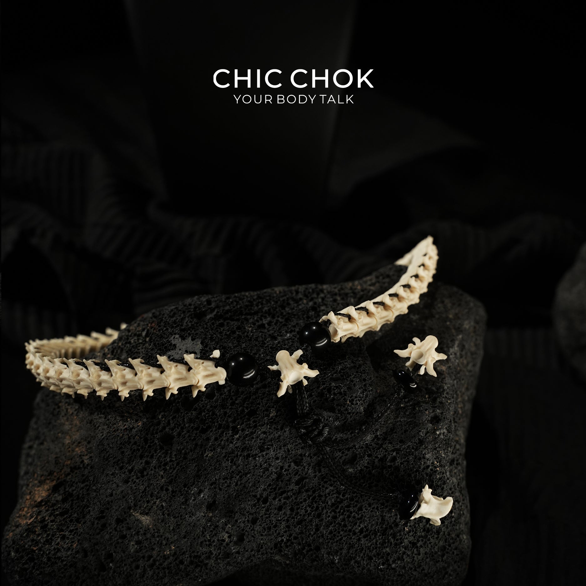 The sharp, angular spines of living bones, each undulation etching the primal power of the wilderness. Polished to a smooth, warm texture, they lend a tangible delicacy to the “wildness”; Jet-black gemstones, like stars frozen in the night sky, adorn the bone chain, infusing primal aesthetics with an ethereal mystique. The bone-shaped pendant dangling at the end amplifies the ritualistic aura of “wilderness whispers”—as if “bone thorns” and “ink shadows” achieve a dark symbiosis upon the neck.